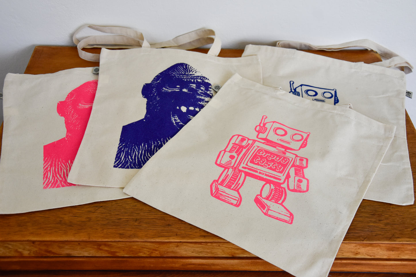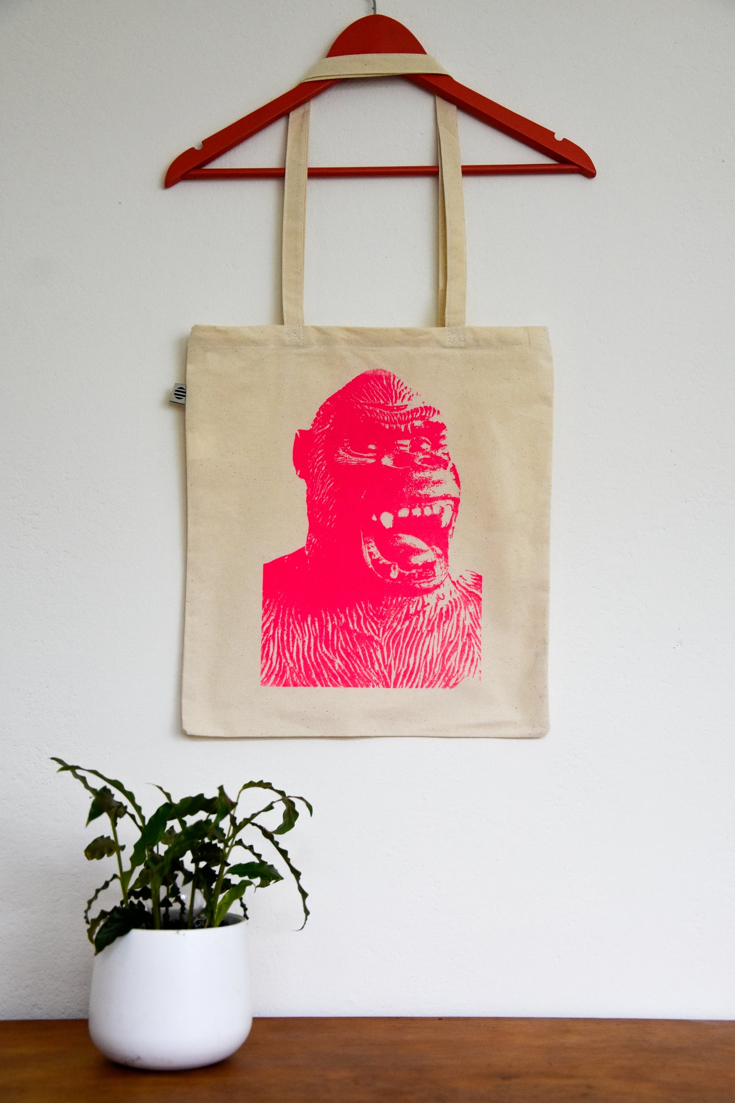 Een katoenen tas bedrukt met de kop van King Kong als speelgoed-aap. Verkrijgbaar in meerdere kleuren.